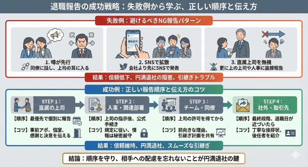 退職を周りに言ってはいけない理由、そして正しい報告の仕方について詳しく解説してきました。